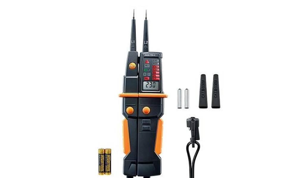 電壓測(cè)試儀 testo 750-3,包括電池、探頭保護(hù)、探頭套、校準(zhǔn)記錄和操作說(shuō)明。